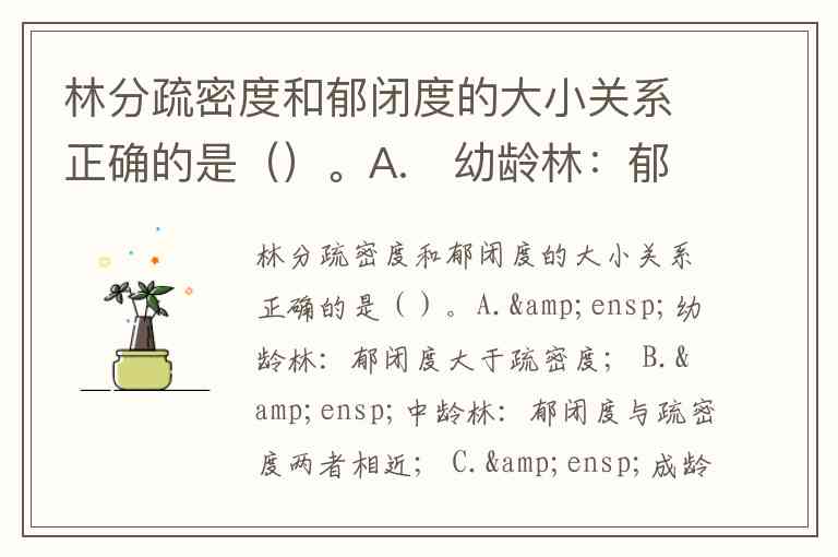 林分疏密度和郁闭度的大小关系正确的是()。A. 幼龄林:郁闭度大于疏密度; B. 中龄林:郁闭度与疏密度两者相近; C. 成龄林:郁闭度小于疏密度; D. 无法确定;