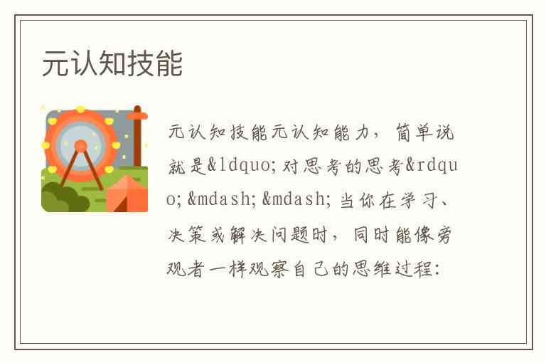 元认知能力,简单说就是“对思考的思考”——当你在学习、决策或解决问题时,同时能像旁观者一样观察自己的思维过程:“我是怎么想到这个结论的?这个思路有没有漏洞?有没有更好的方法?” 这种能力由美国心理学家弗拉维尔在1976年提出,被视为人类认知的“操作系统”,直接决定学习效率、决策质量甚至财富创造能力。