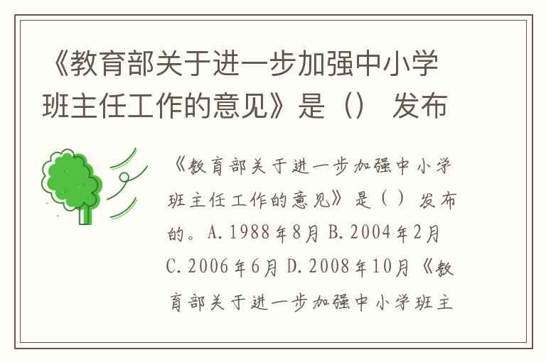 《教育部关于进一步加强中小学班主任工作的意见》是() 发布的。A.1988年8月 B.2004年2月 C.2006年6月 D.2008年10月