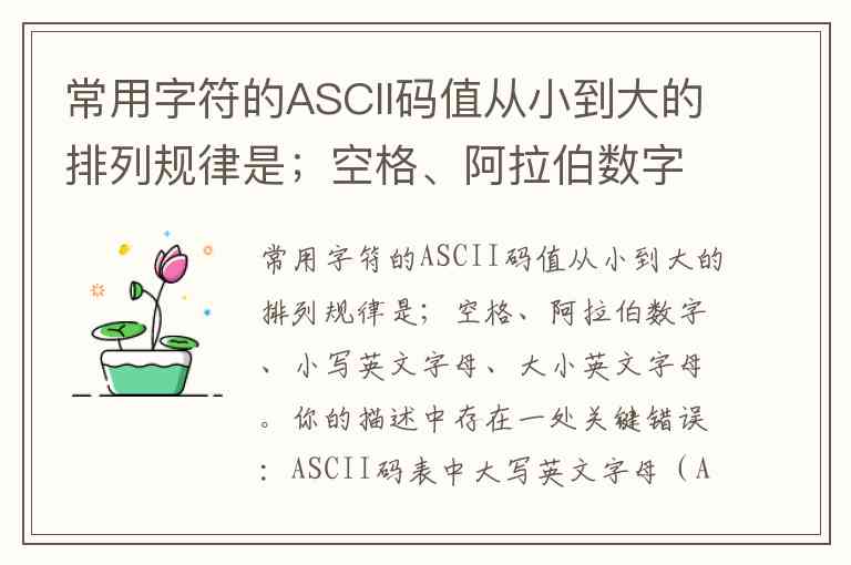 你的描述中存在一处关键错误:ASCII码表中大写英文字母(A-Z)的编码范围是65-90,而小写英文字母(a-z)是97-122,因此正确的顺序应该是:空格(32)→ 阿拉伯数字(48-57)→ 大写英文字母(65-90)→ 小写英文字母(97-122)。