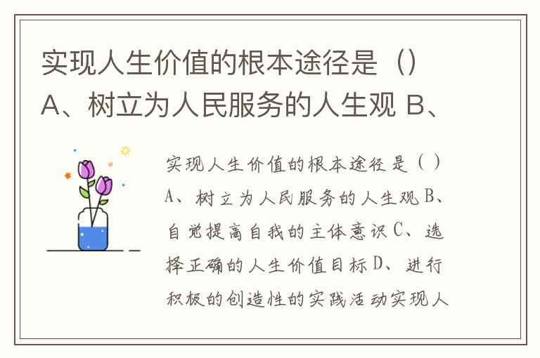 实现人生价值的根本途径是()A、树立为人民服务的人生观 B、自觉提高自我的主体意识 C、选择正确的人生价值目标 D、进行积极的创造性的实践活动