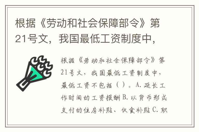 根据《劳动和社会保障部令》第21号文,我国最低工资制度中,最低工资不包括()。A.延长工作时间的工资报酬 B.以货币形式支付的住房补贴、伙食补贴 C.职工中班、夜班补贴 D.职工因在有毒、有害工作环境工作的津贴