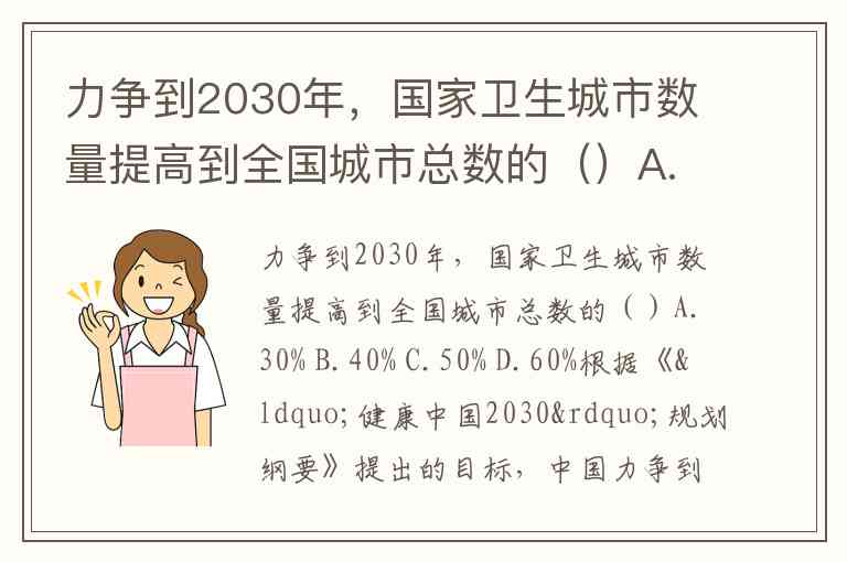 力争到2030年,国家卫生城市数量提高到全国城市总数的()A.30% B.40% C.50% D.60%