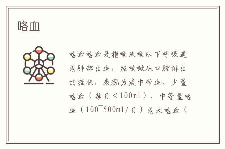 咯血是指喉及喉以下呼吸道或肺部出血,经咳嗽从口腔排出的症状,表现为痰中带血、少量咯血(每日<100ml)、中等量咯血(100~500ml/日)或大咯血(>500ml/日或一次>200ml),后者可能因窒息或失血性休克致死。区分真性咯血与假性咯血(如鼻出血倒流)、呕血至关重要:咯血常伴泡沫痰、鲜红色血液及窒息感,而呕血多为黑色/咖啡色,伴恶心和胃部不适。