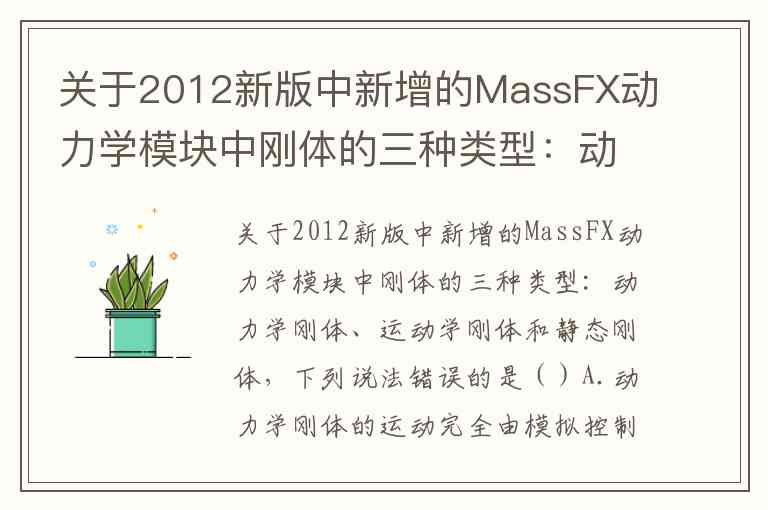 关于2012新版中新增的MassFX动力学模块中刚体的三种类型:动力学刚体、运动学刚体和静态刚体,下列说法错误的是()A.动力学刚体的运动完全由模拟控制,它们会受重力和其他对象的撞击而发生运动。 B.运动学刚体可使用标准方法设置动画,它们不可以是静止对象。 C.运动学刚体可以影响模拟中的动力学刚体对象,但不会受动力学对象影响。 D.在模拟过程中,运动学刚体对象可以随时切换为动态刚体。