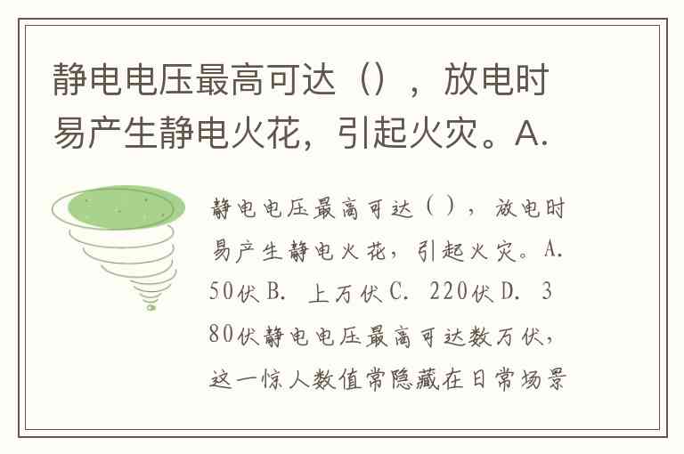 对比选项中的数值:50伏属于安全电压范围,220伏和380伏是常见民用电和工业用电电压,均远低于静电可能达到的量级。因此正确答案为B.上万伏,更精确地说应表述为“数万伏”。这一知识点在化工、石油、电子等行业的安全培训中至关重要,提醒我们需通过接地、增湿、使用防静电材料等手段控制静电危害。