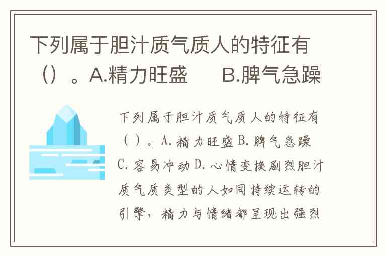 下列属于胆汁质气质人的特征有()。A.精力旺盛 B.脾气急躁 C.容易冲动 D.心情变换剧烈