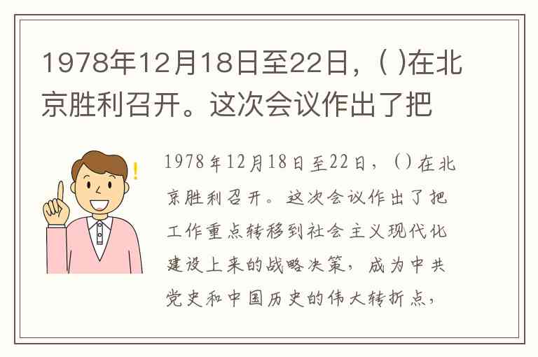 1978年12月18日至22日,( )在北京胜利召开。这次会议作出了把工作重点转移到社会主义现代化建设上来的战略决策,成为中共党史和中国历史的伟大转折点,开辟了中国历史的新纪元。A.党的十一大 B.党的十一届三中全会 C.党的十届三中全会