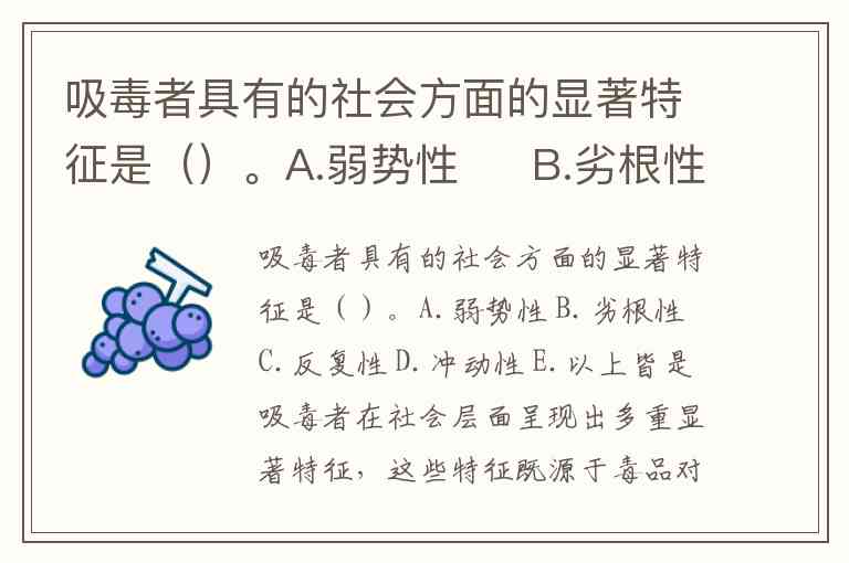 吸毒者具有的社会方面的显著特征是()。A.弱势性 B.劣根性 C.反复性 D.冲动性 E.以上皆是