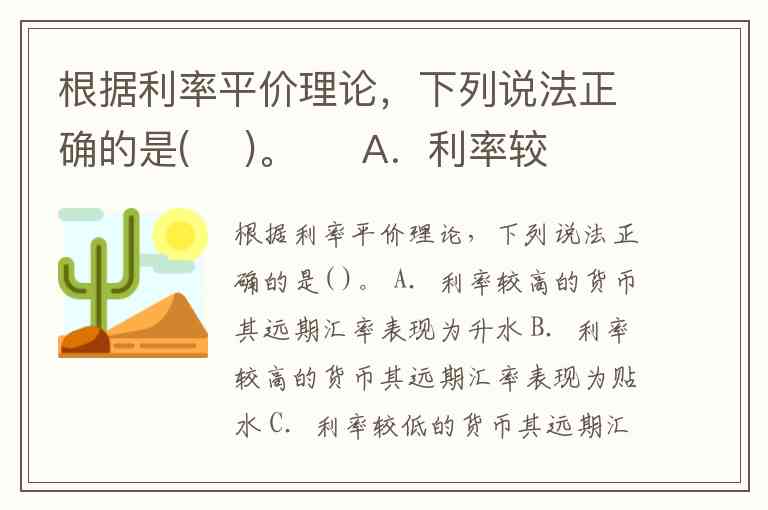 根据利率平价理论,下列说法正确的是( )。 A.利率较高的货币其远期汇率表现为升水 B.利率较高的货币其远期汇率表现为贴水 C.利率较低的货币其远期汇率表现为贴水 D.以上说法均不对A.利率较高的货币其远期汇率表现为升水 B.利率较高的货币其远期汇率表现为贴水 C.利率较低的货币其远期汇率表现为贴水