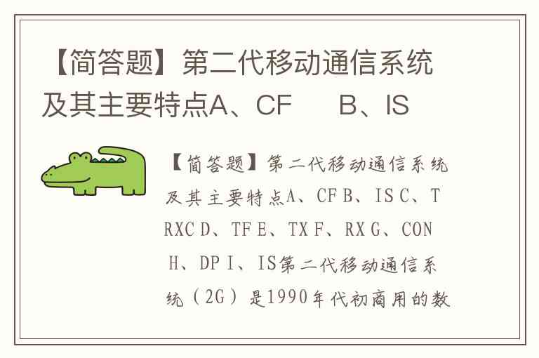 【简答题】第二代移动通信系统及其主要特点A、CF B、IS C、TRXC D、TF E、TX F、RX G、CON H、DP I、IS