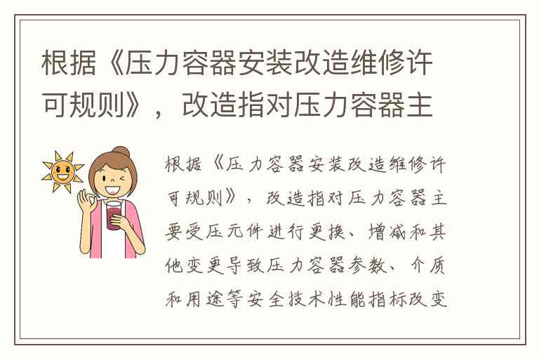 根据《压力容器安装改造维修许可规则》,改造指对压力容器主要受压元件进行更换、增减和其他变更导致压力容器参数、介质和用途等安全技术性能指标改变的活动。