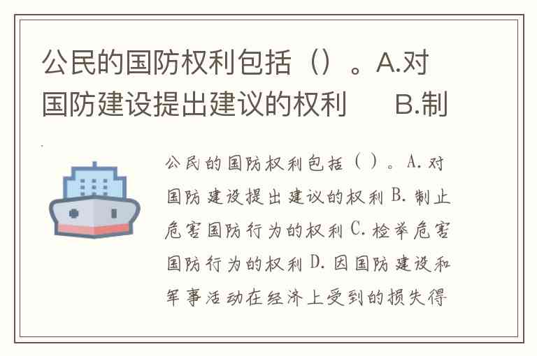 公民的国防权利包括()。A.对国防建设提出建议的权利 B.制止危害国防行为的权利 C.检举危害国防行为的权利 D.因国防建设和军事活动在经济上受到的损失得到补偿的权利