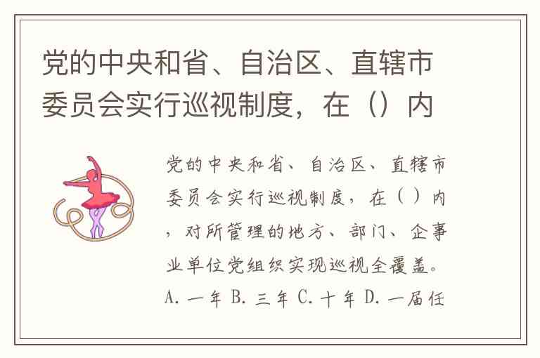 党的中央和省、自治区、直辖市委员会实行巡视制度,在()内,对所管理的地方、部门、企事业单位党组织实现巡视全覆盖。A.一年 B.三年 C.十年 D.一届任期