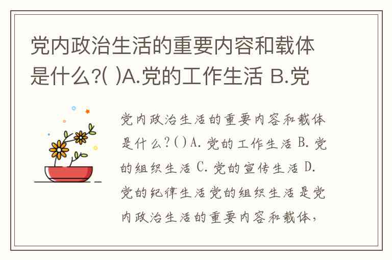 党内政治生活的重要内容和载体是什么?( )A.党的工作生活 B.党的组织生活 C.党的宣传生活 D.党的纪律生活