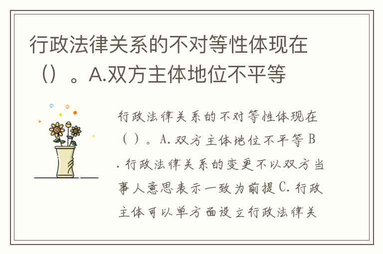 行政法律关系的不对等性体现在()。A.双方主体地位不平等 B.行政法律关系的变更不以双方当事人意思表示一致为前提 C.行政主体可以单方面设立行政法律关系 D.行政主体可以对行政相对人行使强制权