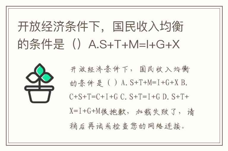 开放经济条件下,国民收入均衡的条件是()A.S+T+M=I+G+X B.C+S+T=C+I+G C.S+T=I+G D.S+T+X=I+G+M