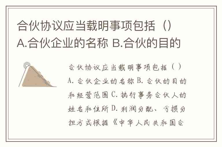 合伙协议应当载明事项包括()A.合伙企业的名称 B.合伙的目的和经营范围 C.执行事务合伙人的姓名和住所 D.利润分配、亏损分担方式