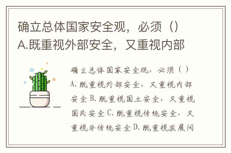 确立总体国家安全观,必须()A.既重视外部安全,又重视内部安全 B.既重视国土安全,又重视国民安全 C.既重视传统安全,又重视非传统安全 D.既重视发展问题,又重视安全问题