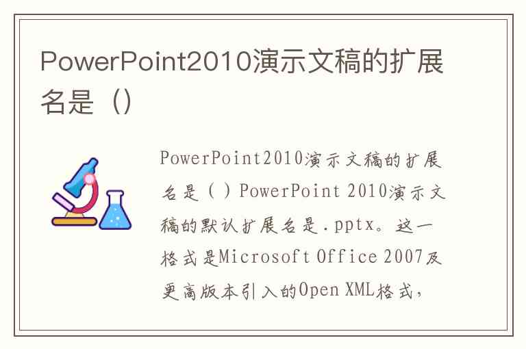 PowerPoint 2010演示文稿的默认扩展名是 .pptx。这一格式是Microsoft Office 2007及更高版本引入的Open XML格式,相比旧版的 .ppt 格式(用于PowerPoint 2003及更早版本),它采用压缩XML结构,通常文件体积更小且恢复能力更强。