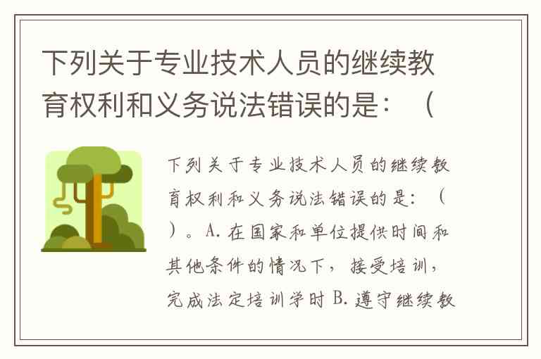 关于专业技术人员继续教育权利和义务的说法中,选项C“在接受继续教育后,不可向所在单位其他职工传授所学的知识与技能”存在错误。这一表述与继续教育的核心目的及实践要求相违背。