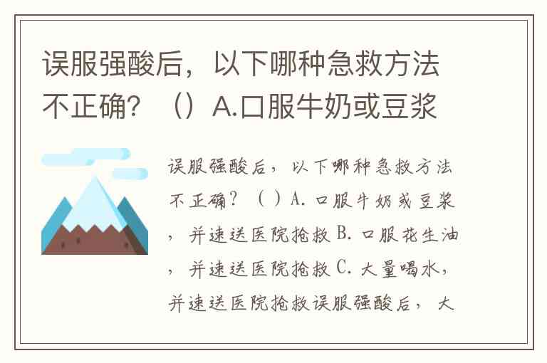 误服强酸后,以下哪种急救方法不正确?()A.口服牛奶或豆浆,并速送医院抢救 B.口服花生油,并速送医院抢救 C.大量喝水,并速送医院抢救
