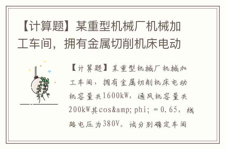 【计算题】某重型机械厂机械加工车间,拥有金属切削机床电动机容量共1600kW,通风机容量共200kW其cosφ=0.65,线路电压为380V。试分别确定车间的计算负荷Pc、Qc、Sc和Ic。
