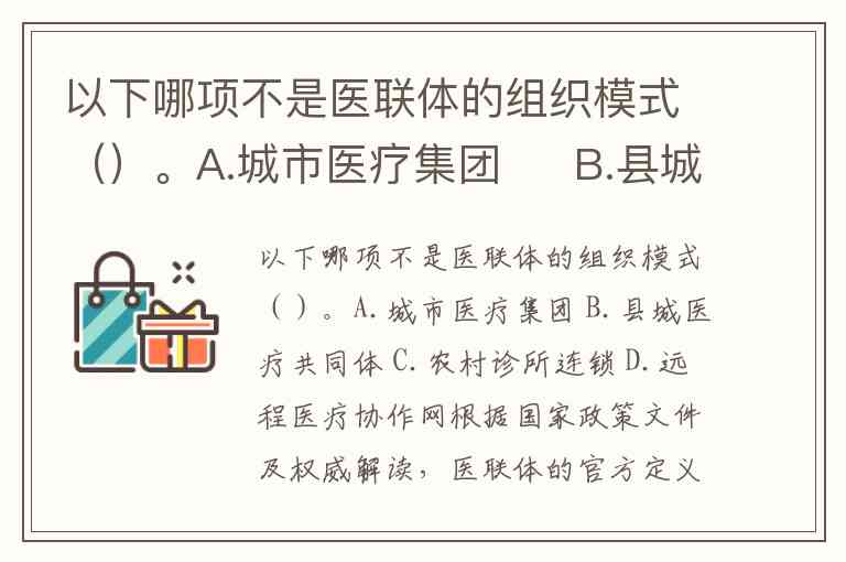 根据国家政策文件及权威解读,医联体的官方定义组织模式明确为城市医疗集团、县域医疗共同体、专科联盟和远程医疗协作网四种。题目选项中,C.农村诊所连锁未被列入这一官方分类体系,因此不是医联体的组织模式。