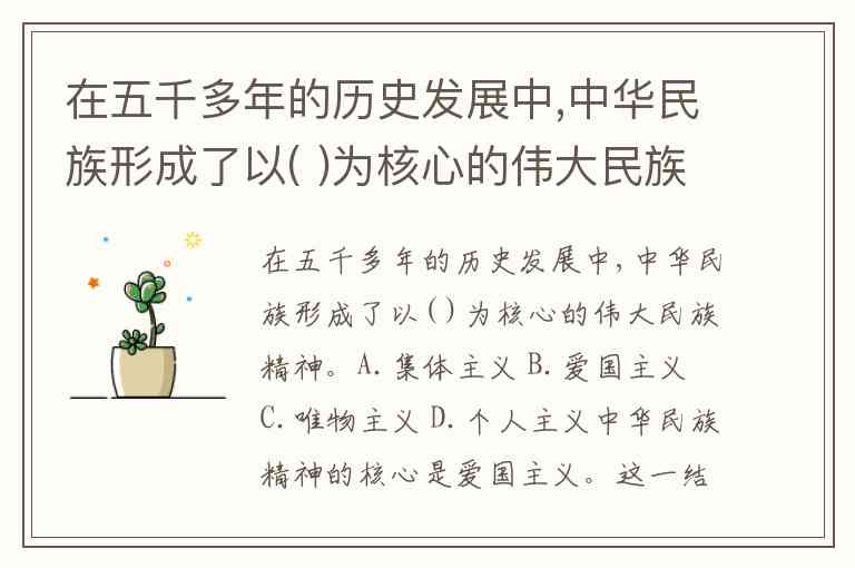 在五千多年的历史发展中,中华民族形成了以( )为核心的伟大民族精神。A.集体主义 B.爱国主义 C.唯物主义 D.个人主义