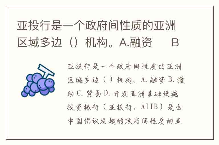 亚投行是一个政府间性质的亚洲区域多边()机构。A.融资 B.援助 C.贸易 D.开发