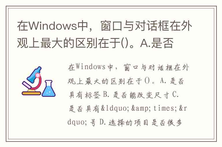 在Windows中,窗口与对话框在外观上最大的区别在于()。A.是否具有标签 B.是否能改变尺寸 C.是否具有“×”号 D.选择的项目是否很多