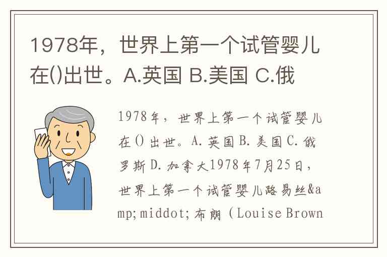 1978年,世界上第一个试管婴儿在()出世。A.英国 B.美国 C.俄罗斯 D.加拿大