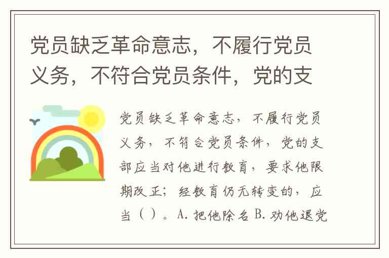 党员缺乏革命意志,不履行党员义务,不符合党员条件,党的支部应当对他进行教育,要求他限期改正;经教育仍无转变的,应当()。A.把他除名 B.劝他退党 C.把他开除 D.进行处分