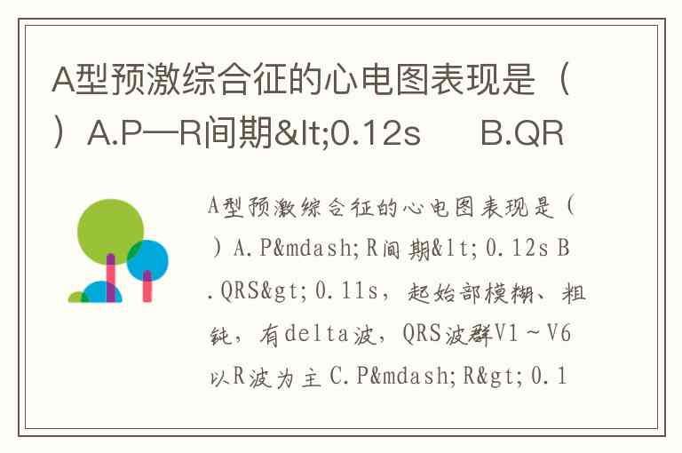 综上,符合A型预激综合征心电表现的选项为 A、B、D。其中,选项B中“V1~V6以R波为主”是A型预激的核心分型依据,而选项E(V1、V2呈QS型)实为B型预激或前间壁心梗的表现,需注意区分。