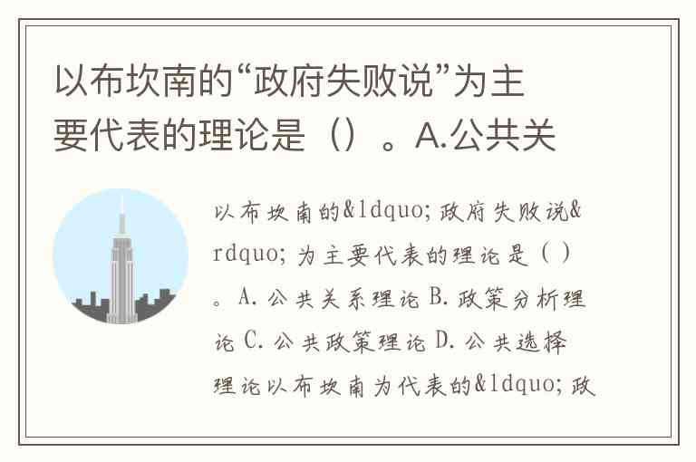 以布坎南的“政府失败说”为主要代表的理论是()。A.公共关系理论 B.政策分析理论 C.公共政策理论 D.公共选择理论
