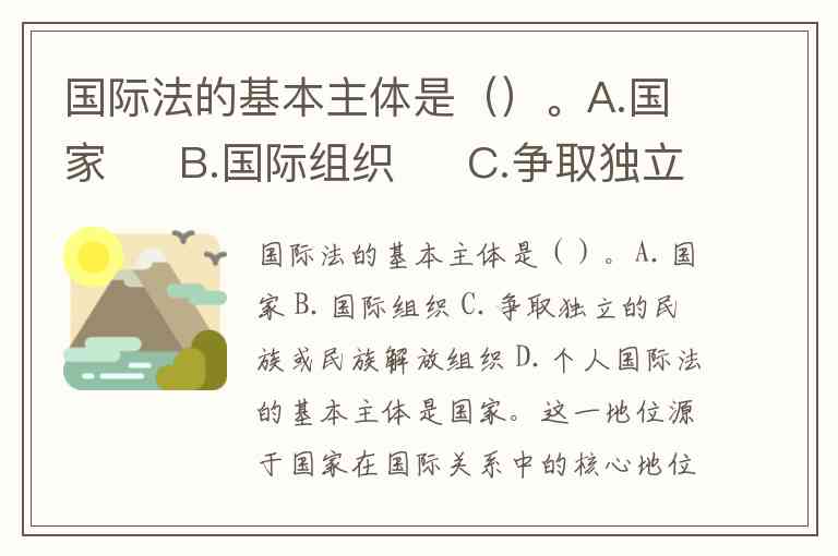 国际法的基本主体是国家。这一地位源于国家在国际关系中的核心地位和完整的权利能力——国家拥有主权,能自主参与各类国际法律关系,既是国际法的制定者、遵守者,也是其基本规范对象。与其他主体相比,国家具有最广泛的国际交往能力,从缔结条约到建立外交关系,其参与国际法律关系的范围和深度远超其他主体。