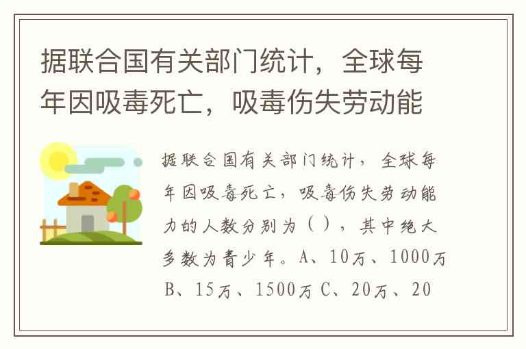 据联合国有关部门统计,全球每年因吸毒死亡,吸毒伤失劳动能力的人数分别为(),其中绝大多数为青少年。A、10万、1000万 B、15万、1500万 C、20万、2000万 D、25万、2500万