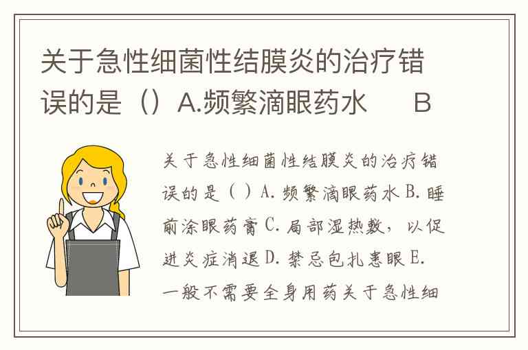 关于急性细菌性结膜炎的治疗错误的是()A.频繁滴眼药水 B.睡前涂眼药膏 C.局部湿热敷,以促进炎症消退 D.禁忌包扎患眼 E.一般不需要全身用药