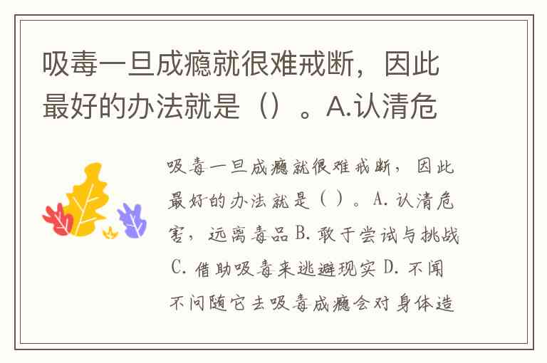 吸毒一旦成瘾就很难戒断,因此最好的办法就是()。A.认清危害,远离毒品 B.敢于尝试与挑战 C.借助吸毒来逃避现实 D.不闻不问随它去