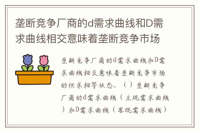 垄断竞争厂商的d需求曲线(主观需求曲线)和D需求曲线(客观需求曲线)相交意味着市场达到供求相等状态。其中,d需求曲线反映单个厂商单独改变价格时预期的需求量,此时厂商假设其他厂商不会跟进调整价格;而D需求曲线则代表所有厂商同步调整价格时该厂商实际面临的需求量。