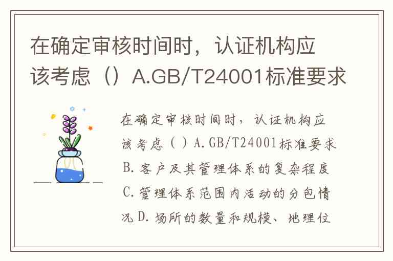 在确定审核时间时,认证机构应该考虑()A.GB/T24001标准要求 B.客户及其管理体系的复杂程度 C.管理体系范围内活动的分包情况 D.场所的数量和规模、地理位置以及对多场所的考虑
