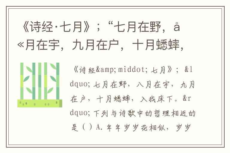《诗经·七月》中“七月在野,八月在宇,九月在户,十月蟋蟀入我床下”以蟋蟀的迁徙轨迹揭示了自然规律的恒定性——昆虫随季节更替调整活动范围,恰如寒暑交替、昼夜轮回般不容违逆。这种对“天道有序”的观察,与选项中C. 天有常道矣,地有常数矣(荀子《天论》)的哲理最为契合,二者都强调自然界存在不以人意志为转移的客观规律。