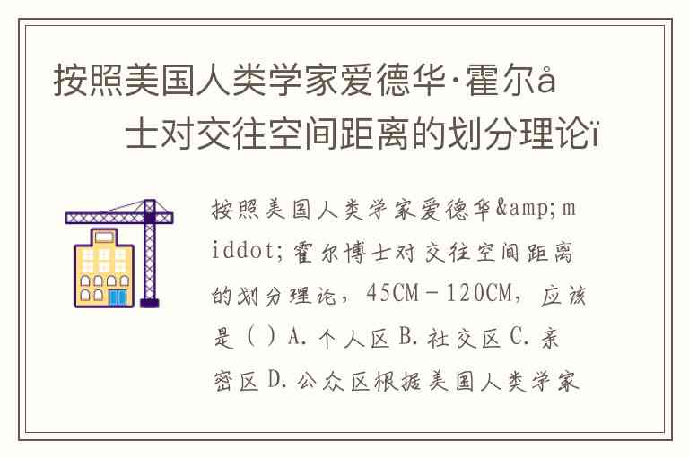 按照美国人类学家爱德华·霍尔博士对交往空间距离的划分理论,45CM-120CM,应该是()A.个人区 B.社交区 C.亲密区 D.公众区