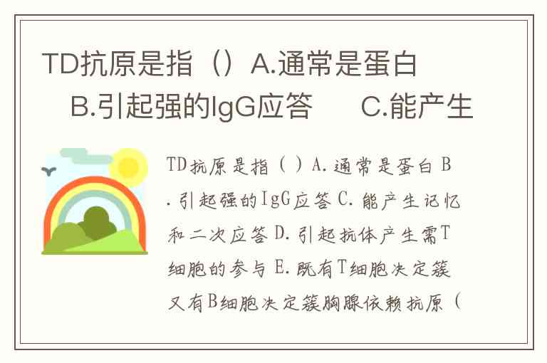 TD抗原是指()A.通常是蛋白 B.引起强的IgG应答 C.能产生记忆和二次应答 D.引起抗体产生需T细胞的参与 E.既有T细胞决定簇又有B细胞决定簇