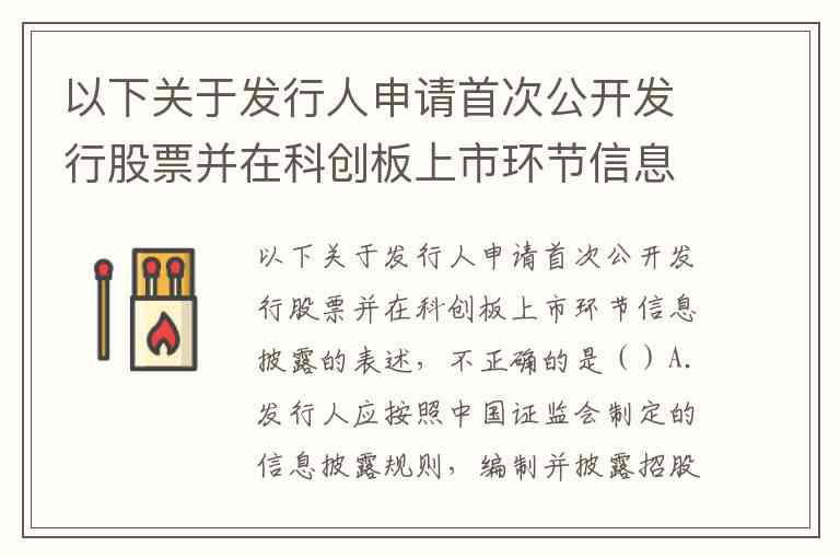 以下关于发行人申请首次公开发行股票并在科创板上市环节信息披露的表述,不正确的是()A.发行人应按照中国证监会制定的信息披露规则,编制并披露招股说明书 B.发行人应当保证发行上市申请文件和信息披露的真实、准确、完整 C.发行人在发行上市申请文件中披露的内容应当简明易懂,语言应当浅白平实 D.对投资者作出价值判断和投资决策有重大影响的信息,发行人可以有选择地披露