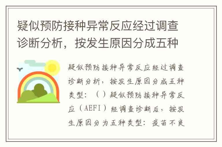 疑似预防接种异常反应(AEFI)经调查诊断后,按发生原因分为五种类型:疫苗不良反应、疫苗质量事故、接种事故、偶合症、心因性反应。