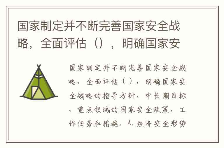 国家制定并不断完善国家安全战略,全面评估(),明确国家安全战略的指导方针、中长期目标、重点领域的国家安全政策、工作任务和措施。A.经济安全形势 B.军事安全形势 C.国内安全形势 D.国际安全形势