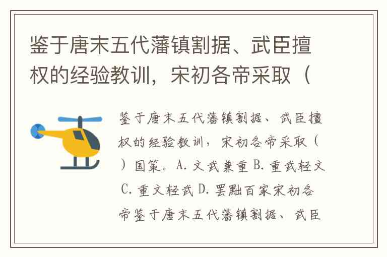 鉴于唐末五代藩镇割据、武臣擅权的经验教训,宋初各帝采取()国策。A.文武兼重 B.重武轻文 C.重文轻武 D.罢黜百家