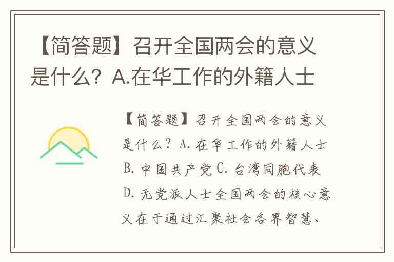 【简答题】召开全国两会的意义是什么?A.在华工作的外籍人士 B.中国共产党 C.台湾同胞代表 D.无党派人士