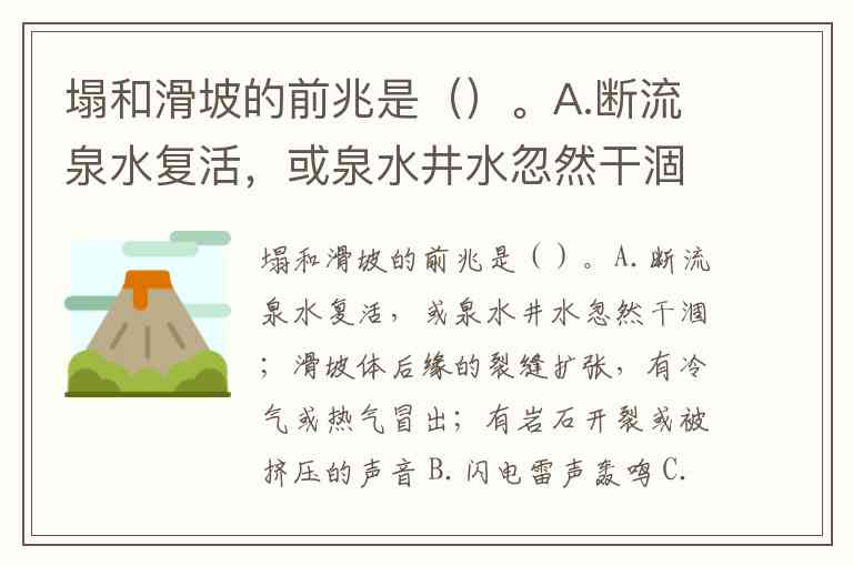 塌和滑坡的前兆是()。A.断流泉水复活,或泉水井水忽然干涸;滑坡体后缘的裂缝扩张,有冷气或热气冒出;有岩石开裂或被挤压的声音 B.闪电雷声轰鸣 C.动物惊恐异常,植物变形